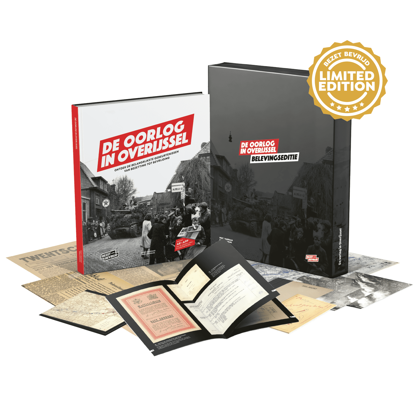 Deze gelimiteerde belevingseditie bevat bovendien tastbare replica’s van originele oorlogskaarten, plattegronden en kranten. Kleinere documenten zoals spionagerapporten, gevechtsverslagen en verzetsbladen zijn samengebracht in een apart bijlagenboekje. Samen vormen ze een meeslepende reis door een periode die Overijssel en zijn inwoners voorgoed heeft getekend.