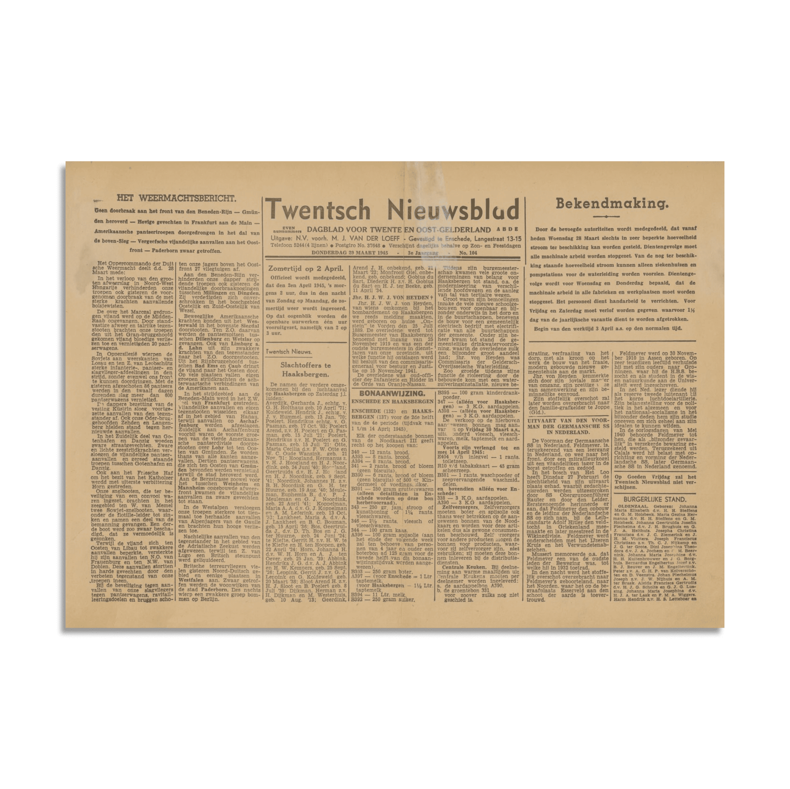 - Exemplaar van de ‘Twentsche Courant’ van 11 april 1945, het eerste nummer na de bevrijding.